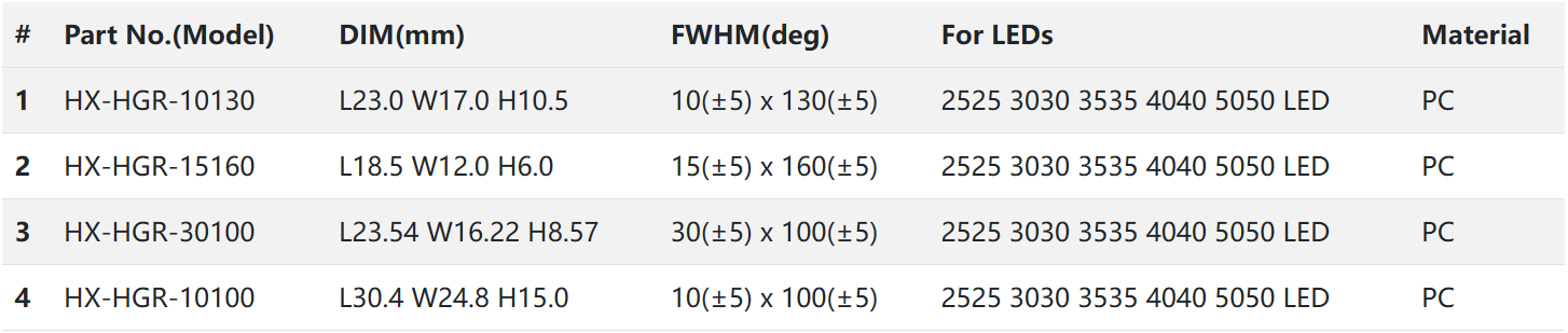 HX-HGR Series lenses are designed to provide precise light control and a stunning experience for urban and technical applications. Superior colour mixing and durable 2K-molded construction allow for ultimate optical performance and durability needed in various outdoor applications such as architectural lighting, wall-washing, obstruction lights, stage lighting, or accent lighting. They are optimized for single and clustered high-power LEDs.