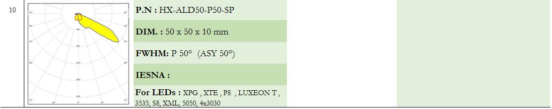 HX-F50 Series optics (50x50mm 2X2 arrays) ensure optimal lighting conditions for both players and spectators that meet the standards and requirements of different sports,for flood lights,tunnel lights,stadium lights,parking lot lighting.Beams are designed for symmetrical and asymmetrical low glare sports floodlights. Optimized for HP 3535 and compatible with up to 5050 size flat LED packages.