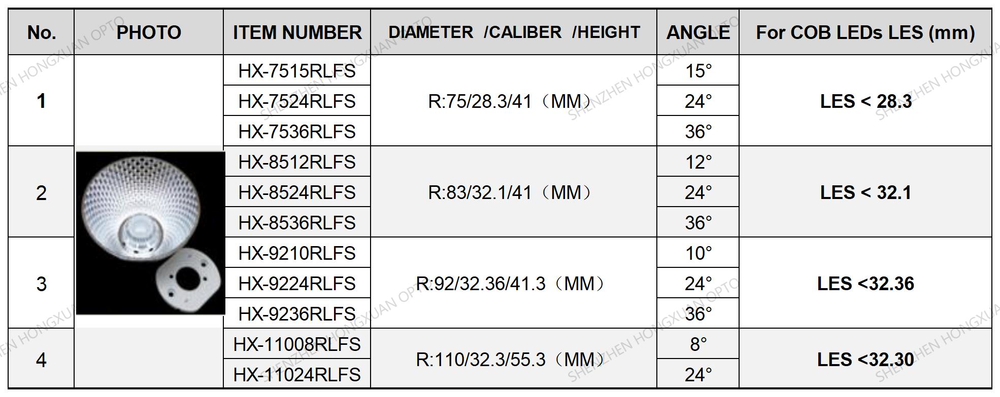 Hongxuan optics reflectors are made from aluminum and share the same clean and consistent look and beam variants throughout the entire product family. They have high heat resistance and offer premium light quality for any track- or downlight luminaires. With a wide range of compatible connectors and Hongxuan optics original accessories, they are the most up-to-date reflector offering available.Can perfectly fit COB LEDs such as Bridgelux, Citizen, Cree, Osram, Samsung, Lumileds, LEXTAR, etc.