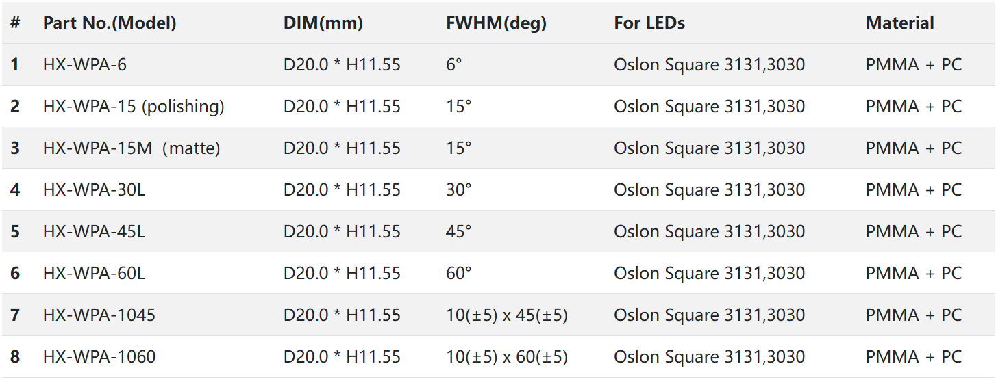 The HX-WPA Series of optical LED lenses: All subfamilies have the same dimensions and come preassembled in lightweight, durable holders with fastening tape that makes their installation fast and easy. The HX-WPA Series family has a wide selection of beams from narrow to wide flood. Perfectly compatible with CREE, OSRAM, Lumileds, Samsung 3030, 3131 LEDs, etc. Widely used in basketball court lighting, gymnasium lighting, badminton court lighting, volleyball court lighting, underwater lighting, outdoor landscape lighting (or lens), security equipment, traffic display lighting (or lens), electronic components, automotive lamp lenses, beam lamp lenses, and stage lighting.