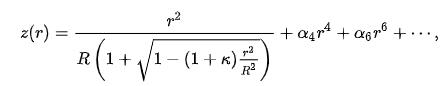 where the optic axis is presumed to lie in the z direction, and z(r) is the sag—the z-component of the displacement of the surface from the vertex, at distance r from the axis. The coefficients alpha;describe the deviation of the surface from the axially symmetric quadric surface specified by R and kappa . If the coefficients alpha are all zero, then R is the radius of curvature and kappa is the conic constant, as measured at the vertex (where r=0). In this case, the surface has the form of a conic section rotated about the optic axis, with form determined by kappa :