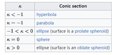 where the optic axis is presumed to lie in the z direction, and z(r) is the sag—the z-component of the displacement of the surface from the vertex, at distance r from the axis. The coefficients alpha;describe the deviation of the surface from the axially symmetric quadric surface specified by R and kappa . If the coefficients alpha are all zero, then R is the radius of curvature and kappa is the conic constant, as measured at the vertex (where r=0). In this case, the surface has the form of a conic section rotated about the optic axis, with form determined by kappa :