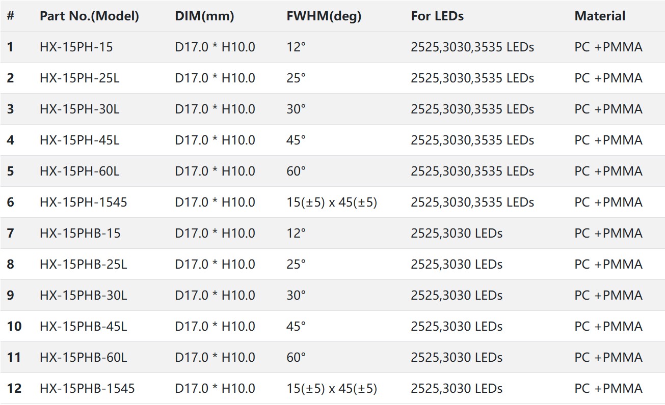 D17.0x H10.0mm with holder .HX-15PH series of lenses, measuring less than 17 mm in diameter and less than 10 mm tall, All subfamilies have the same dimensions and come preassembled in lightweight durable holders with fastening tape that makes their installation fast and easy. HX-15PH family has a wide selection of beams from narrow to wide flood.