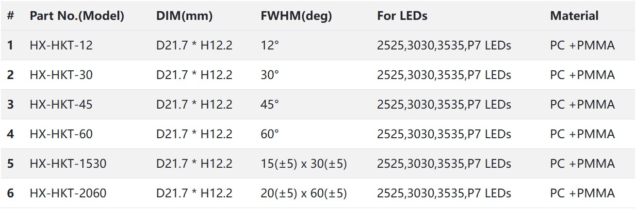 D21.7x H12.2mm with holder .HX-HKT series designed to be used with multi-chip RGB-LEDs and provide colour-mixing to achieve full colour lighting with good colour uniformity. Narrow, medium and oval beam spreads available as well as easy snap-on sublenses to change beam from spot to medium or spot to oval.
