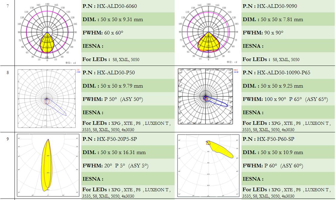 HX-F50 Series optics (50x50mm 2X2 arrays) ensure optimal lighting conditions for both players and spectators that meet the standards and requirements of different sports,for flood lights,tunnel lights,stadium lights,parking lot lighting.Beams are designed for symmetrical and asymmetrical low glare sports floodlights. Optimized for HP 3535 and compatible with up to 5050 size flat LED packages.
