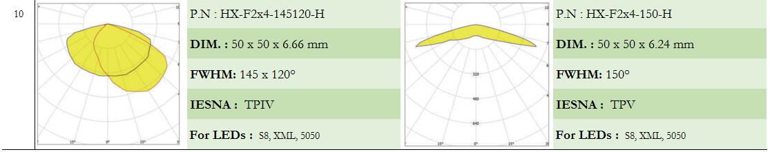 HX-F2x4-xx Series optics (50x50mm 2X4 arrays) ensure optimal lighting conditions for both players and spectators that meet the standards and requirements of different sports,for flood lights,tunnel lights,stadium lights,parking lot lighting high bay lighting.Beams are designed for symmetrical and asymmetrical low glare sports floodlights. Optimized for HP 3535 and compatible with up to 5050 size flat LED packages.