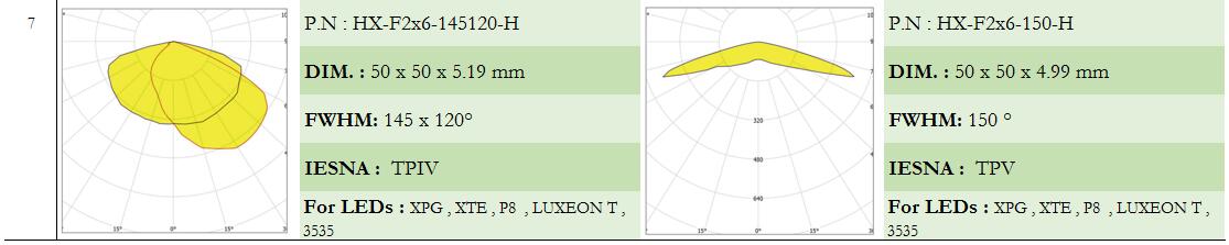 HX-F2x6-xx Series optics (50x50mm 2X6 arrays) ensure optimal lighting conditions for both players and spectators that meet the standards and requirements of different sports,for flood lights,tunnel lights,stadium lights,parking lot lighting.Beams are designed for symmetrical and asymmetrical low glare sports floodlights. Optimized for HP 3535 and compatible with up to 5050 size flat LED packages.