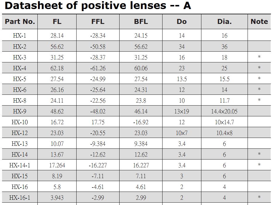 BFL= Back of focus ; CT= Center Thickness ; ET = Edge Thickness